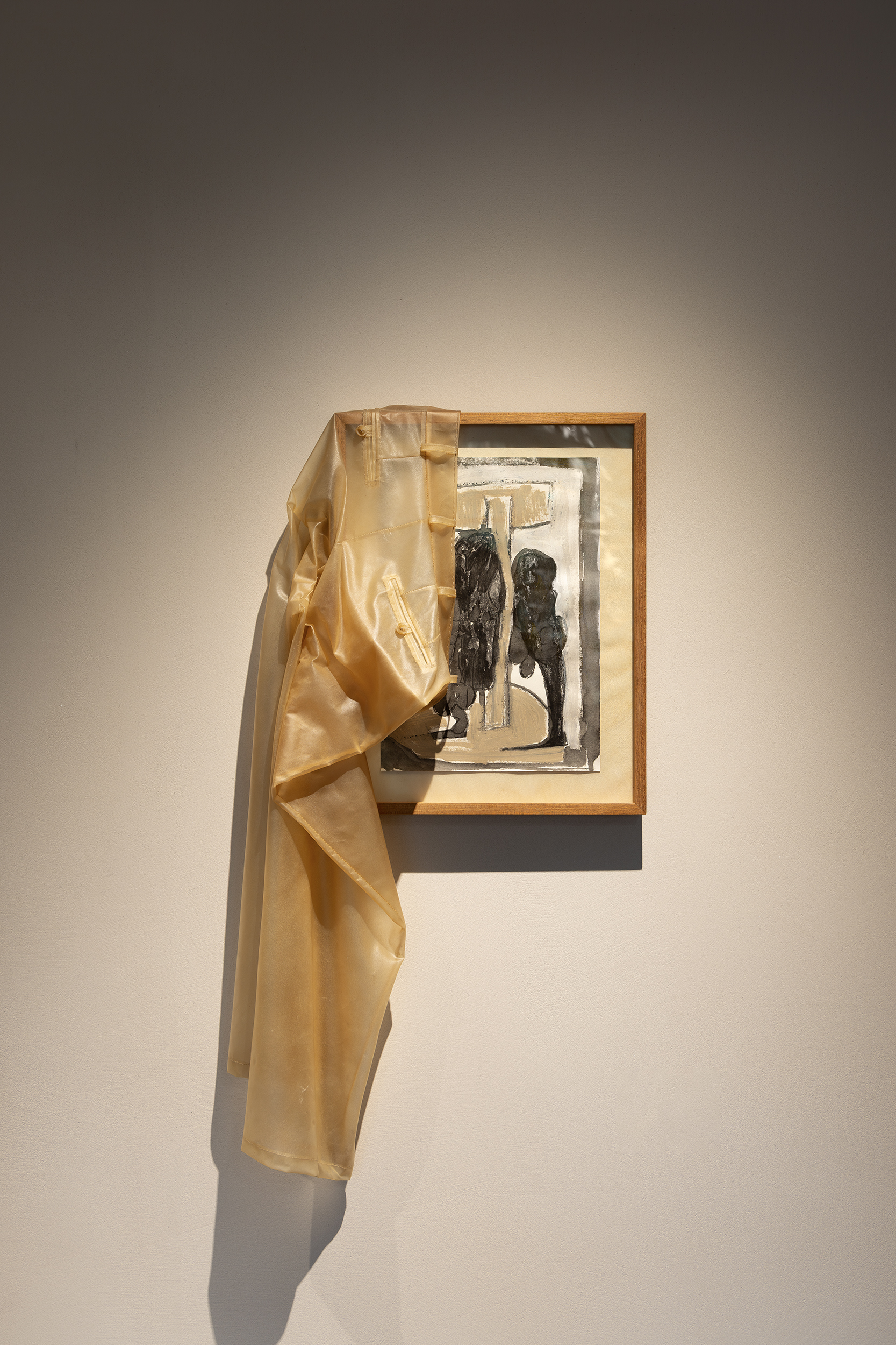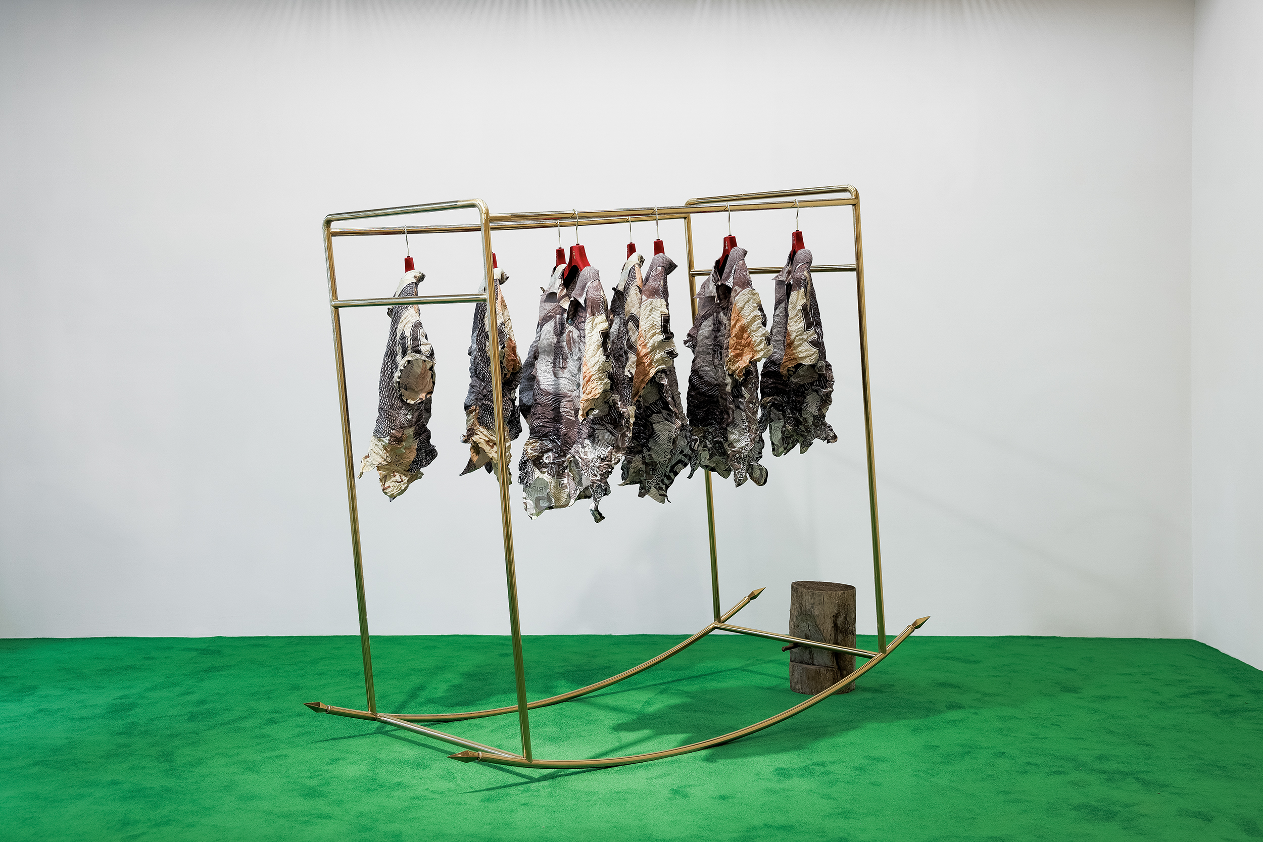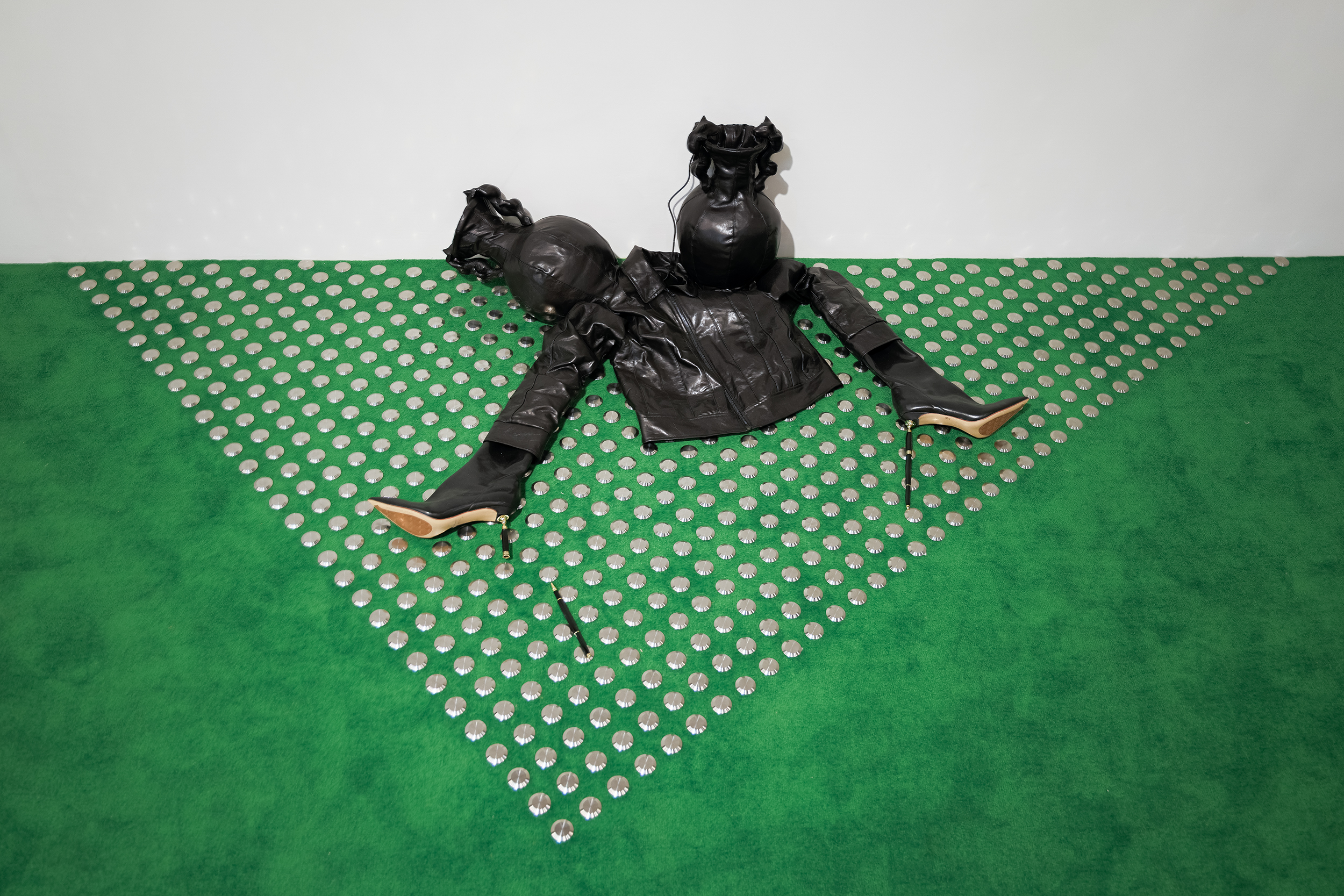 Coro de Soles Menores adopta el gesto de inclinarse para cuestionar el espacio compartido de ternura y violencia. Ninfa del río Luo (2025) crea nuevos mitos a través de una gabardina de canoa hecha de piel de vaca transparente, extendida sobre escaleras de bambú. Su título se inspira en el pergamino de la dinastía Song que visualiza el poema de Cao Zhi, escrito en el año 222 d. C., que describe su encuentro romántico imaginario con la diosa del río Luo en el centro de China. El pergamino marcó uno de los primeros momentos de la historia del arte chino, donde la poesía, la caligrafía y la pintura convergieron en un único gesto de elegancia.