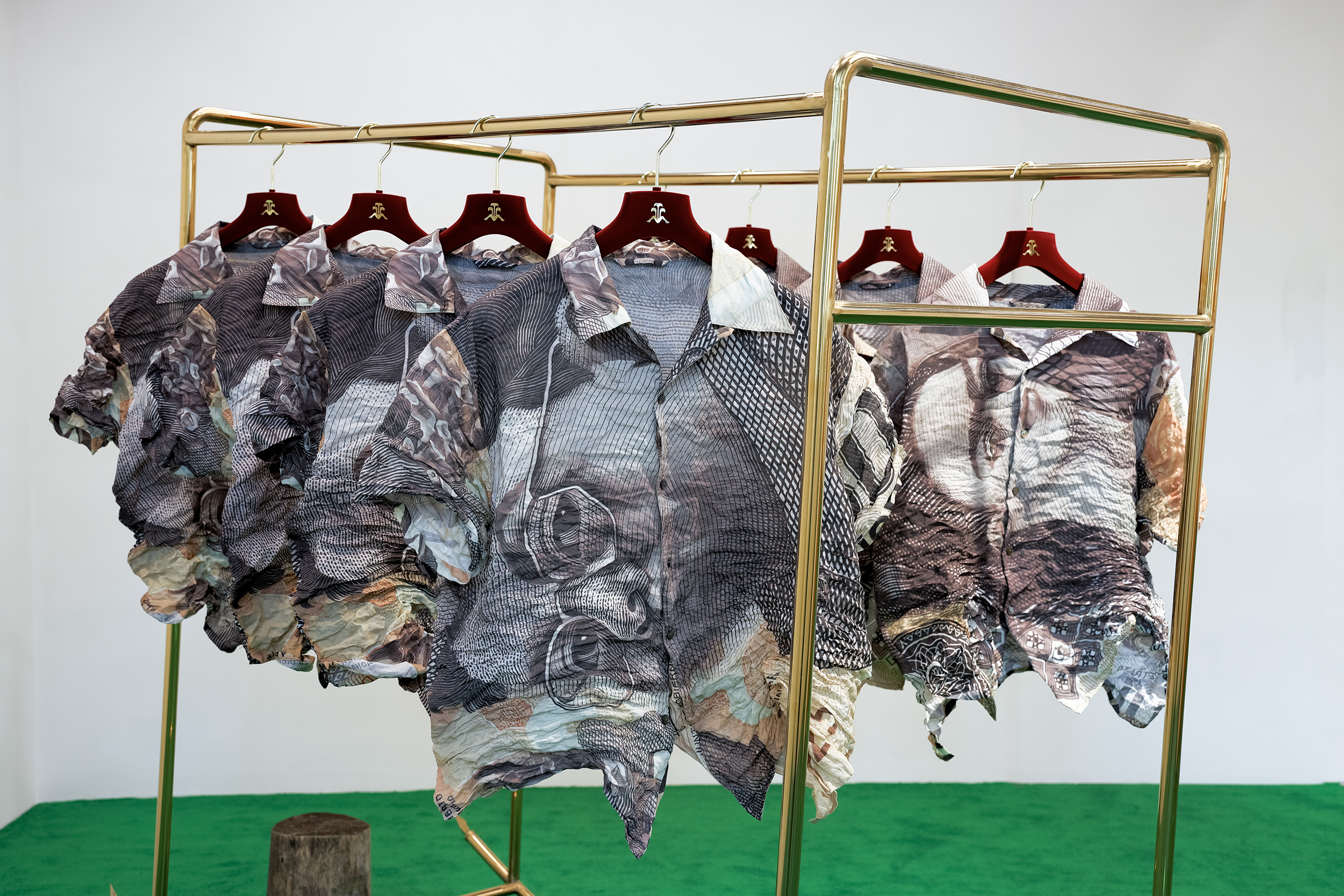 En China, Sánchez-Kane observó las transacciones monetarias invisibles a través de pagos móviles. En respuesta, imprimió moneda en Intercambio Vernácular (2025): una prenda y también una edición artística confeccionada con tela con memoria metálica, un material que evoca los minerales del magma. La camisa lleva la imagen del billete de 500 pesos mexicanos, donde los rostros de Frida Kahlo y Diego Rivera se miran en direcciones opuestas. La estructura inclinada perturba los símbolos establecidos para generar nuevas interpretaciones, nuevas circulaciones de significado.