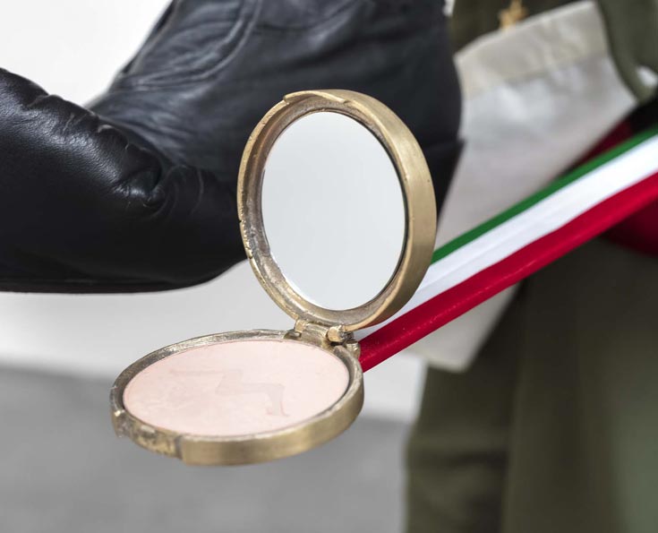 In the gallery space, the video was accompanied by a striking sculpture: three military figures, also garbed in Sánchez Kane’s subverted uniforms, held together by a golden flagpole going in and out of their asses and mouths. Out of their groins grew an erect medal, ending with a make-up compact bearing Sánchez Kane’s logo, a reference to the prevalence, the ready availability of patriarchal, nationalistic discourse, infiltrating everyone’s homes and minds like catalog products. The impaled soldiers’ golden faces were made out of a cast of the artist's own face, nodding to the role we play in the upholding of our authority figures. The ways in which the military uniform mirrors our own tendency to uniformity: high fashion, micro trends also work as identifiers and difference-markers, clothes as the very first layer through which we read and judge others and ourselves. The critique of authoritarian masculinity and the violence it entails, was completed by a nearby vacuum sealed uniform, perfectly folded flat —a neat comment on it's ready-to-wear-ness, how quickly we all accept authoritarian rule over our lives, but also on the sinister nature of that power, its links to dark money and money laundering.