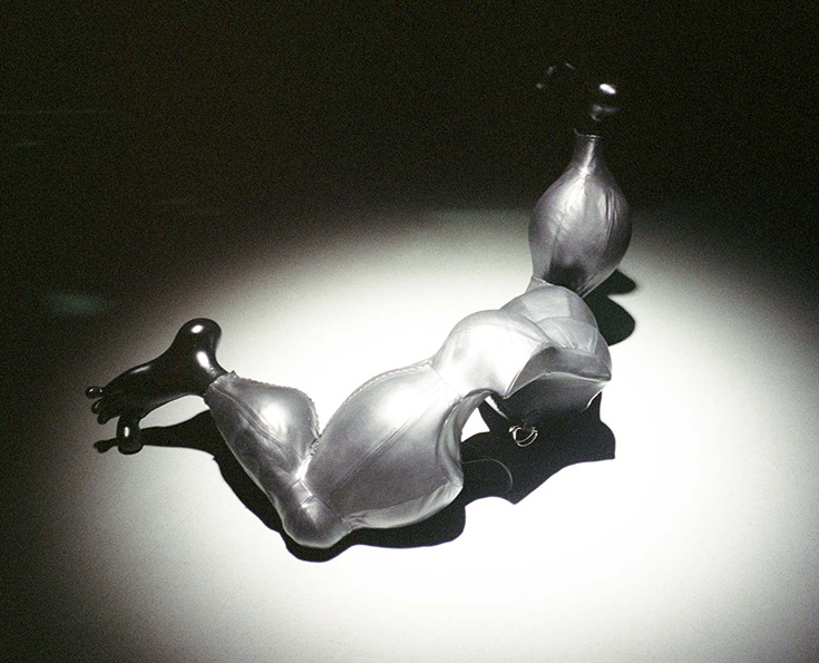 Un ser contrahecho y angustiado al centro de la escena. Sus concavidades se deforman al tirar de su piel de cinturones: ¿qué yace más allá de los orificios?, ¿qué oculta este hoyo negro? Algunos elementos de su estructura tripoidal escapan a la vista: una pierna, unos guantes, una flecha ausente. Suma que jamás alcanza la totalidad: es el regocijo en el artificio y la desmesura, es ese punto de fuga que desorienta al ojo. Cadáver exquisito o tejido ritual que bárbara sánchez-kane ha convertido en un altar minimalista para dover street market parís.